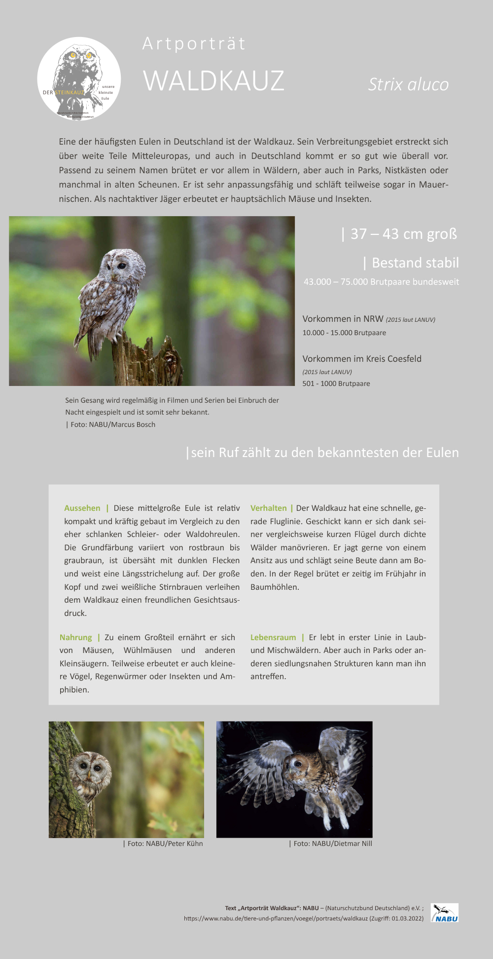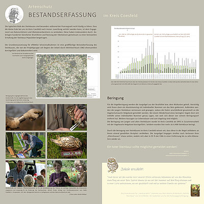 Das Artenschutzprogramm „Steinkauz“, 1981 gestartet, umfasst neben der Bestandserfassung auch die Pflege alter Obstwiesen, den Bau und die Wartung von Niströhren sowie die jährliche Beringung der Jungvögel – ein Höhepunkt jedes Brutjahres. Die Arbeit wurde über Jahrzehnte von Winfried Rusch und später Franz Rolf vom NABU Coesfeld geprägt.