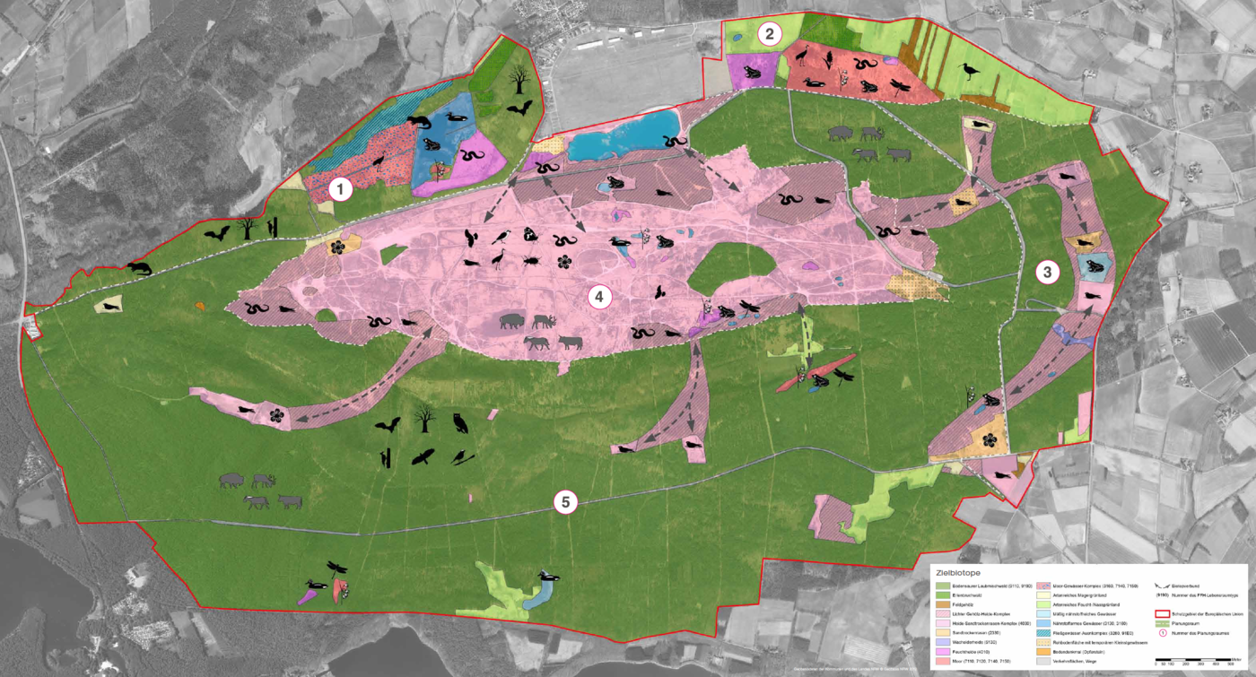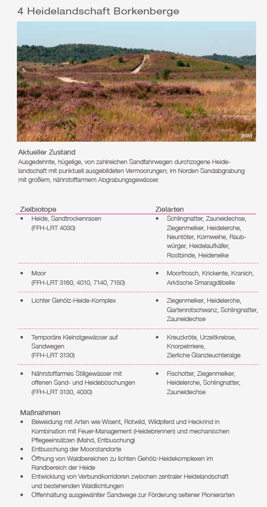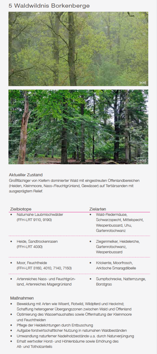 Im April 2016 haben das Naturschutzzentrum Kreis Coesfeld sowie die Biologische Station Kreis Recklinghausenund die Biologische Station Zwillbrock eine Karte mit den naturschutzfachlichen Zielen für die Borkenberge erarbeitet. Zentrales Element ist das Projekt „Westfalens Wilder Westen“, das eine ganzjährige einer rund 550 Hektar großen Fläche mit Megaherbivoren vorsieht, vornehmlich Wisent, Heckrind, Wildpferd und Rotwild (Olthoff et al. 2016). Die artspezifischen Fraß- und Bewegungsmuster dieser Tierarten leisten einen wesentlichen Beitrag zur Offenhaltung der sandgeprägten Lebensräume sowie zur Sicherung und Förderung ihrer charakteristischen Lebensgemeinschaften. Ergänzend zur Beweidung kommen weitere Pflegemaßnahmen zum Einsatz. Dazu gehören Entkusselung, Heidebrennen sowie eine gezielte Befahrung der Sandwege mit schweren Fahrzeugen im Rahmen von Übungseinsätzen der Blaulichtorganisationen (Technisches Hilfswerk, Polizei, Feuerwehr). Diese Maßnahmenkombination stellt eine effektive Strategie zur langfristigen Erhaltung und Entwicklung der Sandlebensräume dar. Neben einer erwarteten Zunahme der Biodiversität eröffnet das Konzept die Möglichkeit, das Gebiet für einen naturverträglichen Erlebnistourismus zugänglich zu machen und zugleich illegale Nutzungen wie das Motocross-Fahren wirksam zu unterbinden. Zu den prioritären naturschutzfachlichen Zielsetzungen zählen neben dem Erhalt und der Optimierung Heidelandschaft auch die Förderung strukturreicher Übergangsbereiche zwischen Wald und Offenland sowie die Verbindung einzelner isolierter Lichtungen mit dem zentralen Offenland durch geeignete Korridore.