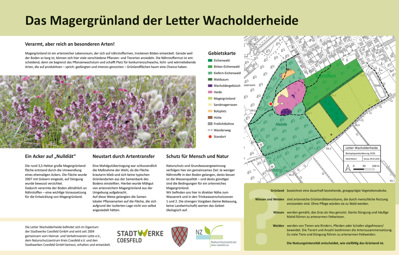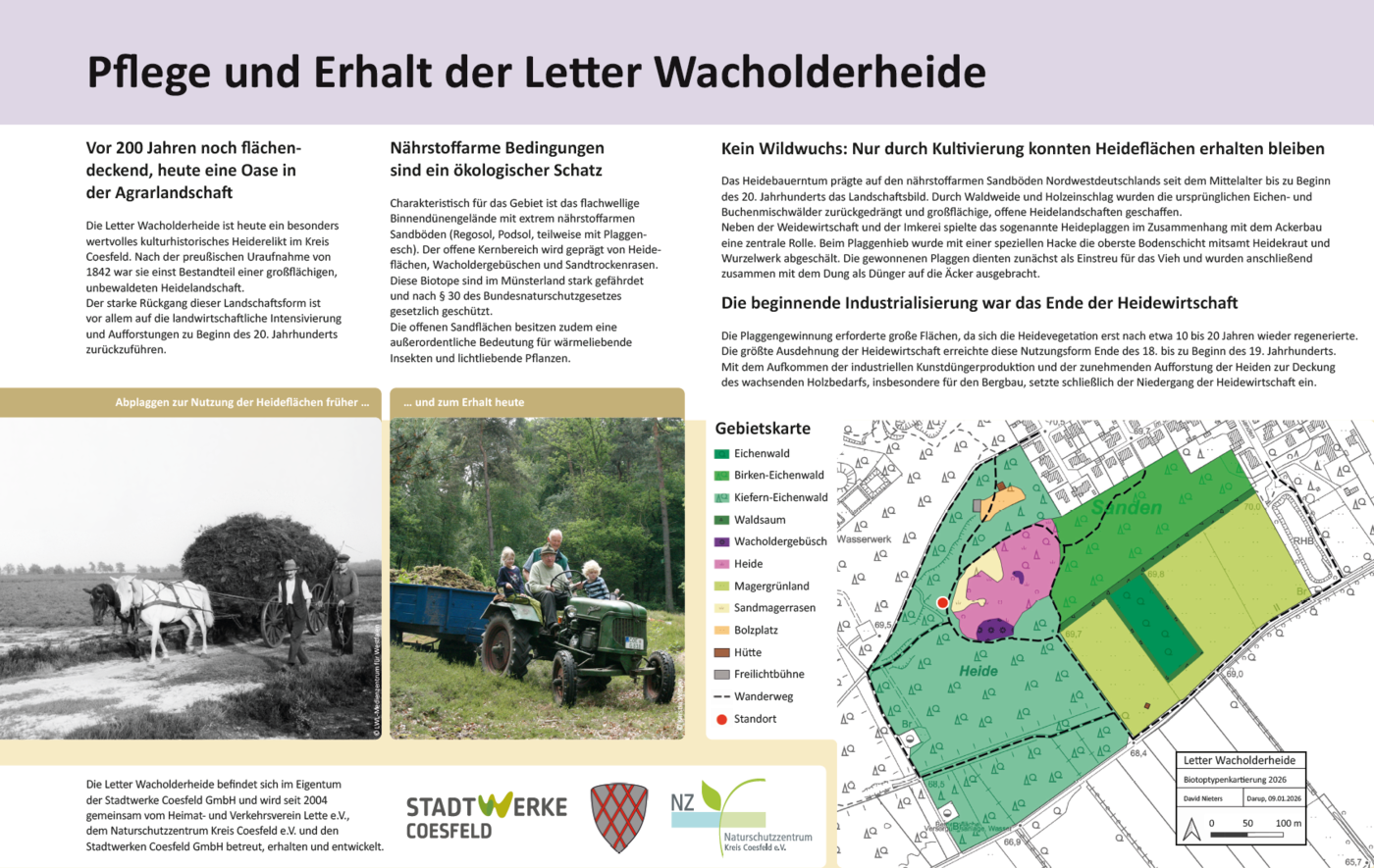 Die Letter Wacholderheide besteht nicht nur aus Heide und Waldflächen, sondern auch aus, magerem Grünland. Dieses wird extensiv von Schafen beweidet – eine traditionelle und besonders schonende Form der Landschaftspflege, die wesentlich zum Erhalt des Schutzgebietes beiträgt.