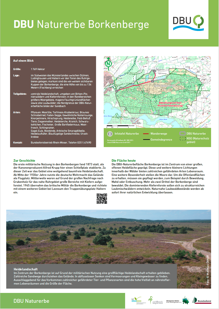 Der rund 1.800 Hektar große, ehemalige Truppenübungsplatz Borkenberge steht seit 2002 unter europäischem Schutz und stellt einen landesweit bedeutsamen Bestandteil der münsterländischen Sandlandschaft dar. Nach einer über 140-jährigen militärischen Nutzung endete der Übungsbetrieb mit dem Abzug der britischen Rheinarmee am 31. Mai 2015. Ein Großteil der Liegenschaft (1.768 Hektar) wurde 2016 in das Nationale Naturerbe überführt und befindet sich heute im Eigentum der DBU Naturerbe GmbH. Das Sand-Abgrabungsgelände im Norden gehört der Borkenberge Gesellschaft e.V. (Betreiber Flugplatz Borkenberge).