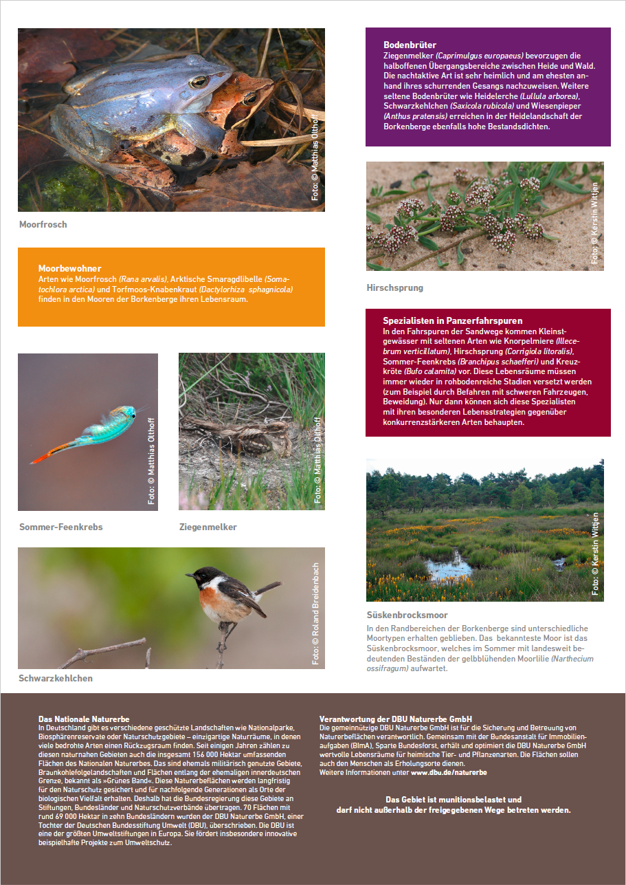 Daneben bieten die von dem militärischen Übungsbetrieb weitgehend unbeeinflussten Moore im Randbereich der Borkenberge sehr selten gewordenen Spezialisten wie Moorameise, Arktische Smaragdlibelle, Kreuzotter, Gageleule, Krickente und Moorlilie geeignete Lebensräume.