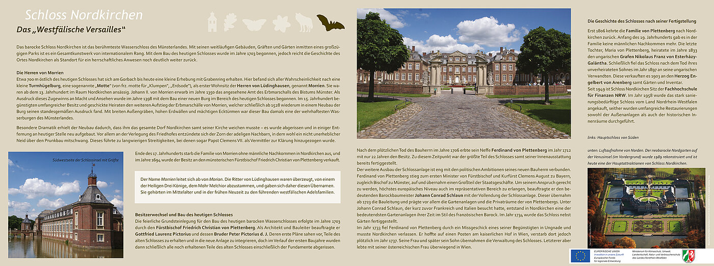 Das imposante, barocke Wasserschloss Nordkirchen ist nicht der erste Herrensitz an dieser Stelle. Es ruht auf Fundamenten, deren Steinmaterial von der trutzigen Wasserburg „Nortkirchen“ stammt, die zu den mächtigsten des Münsterlandes zählte. In der zu Beginn des 15. Jahrhunderts errichteten Wasserburg lebten die Ritter von Morrien, die ihren ersten Wohnsitz vielleicht in einer „Motte“ im benachbarten NSG Hirschpark hatten. 1694 ging das Anwesen gegen Zahlung von 250.000 Reichstalern in den Besitz von Fürstbischof Friedrich Christian von Plettenberg-Lenhausen über. Im Jahre 1703 wurde die alte Wasserburg abgerissen und nach den Plänen des Baumeisters Gottfried Laurenz Pictorius in holländisch-westfälischem Barock unter Verwendung von Baumberger Sandstein als Familienschloss neu erbaut.