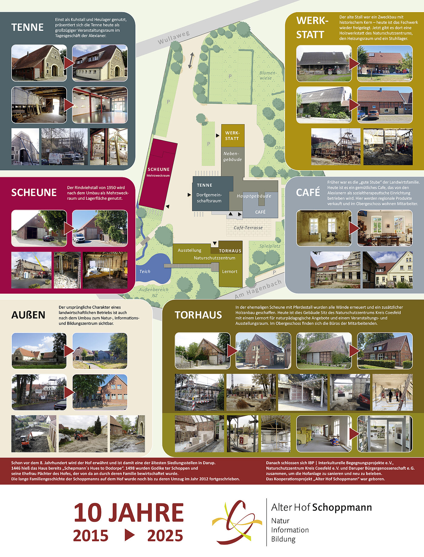 Schon vor dem 8. Jahrhundert wird der Hof erwähnt und ist damit eine der ältesten Siedlungsstellen in Darup. 1446 hieß das Haus bereits „Schepmann´s Hues to Dodorpe“. 1498 wurden Godike ter Schoppen und seine Ehefrau Pächter des Hofes, der von da an durch deren Familie bewirtschaftet wurde. Die lange Familiengeschichte der Schoppmanns auf dem Hof wurde noch bis zu deren Umzug im Jahr 2012 fortgeschrieben. Danach schlossen sich IBP | Interkulturelle Begegnungsprojekte e.V., Naturschutzzentrum Kreis Coesfeld e.V. und Daruper Bürgergenossenschaft e.G. zusammen, um die Hofanlage zu sanieren und neu zu beleben. Das Kooperationsprojekt „Alter Hof Schoppmann“ war geboren.